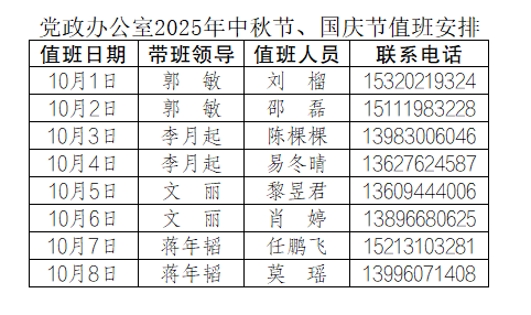 为更好地服务全校师生,保障国庆节期间学校相关工作顺利开展,党政办公室每天均安排值班人员,负责学校校章、党委印章、法人印章、学校合同章、党政办公室印章等用印,学校介绍信开具,公文签发审核,会议室申请及使用等工作,请需求单位或师生按规定流程履行签批手续,其他未尽事宜,请与值班老师联系。