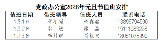 为更好地服务全校师生,保障元旦节期间学校相关工作顺利开展,党政办公室每天均安排值班人员,负责学校校章、党委印章、法人印章、学校合同章、党政办公室印章等用印,学校介绍信开具,公文签发审核,会议室申请及使用等工作,请需求单位或师生按规定流程履行签批手续,其他未尽事宜,请与值班老师联系。